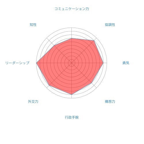 シエナ研究機構による最新の歴代アメリカ大統領ランキング。1、経歴(家系、教育、経験)、2、党首としての指導力、3、コミュニケーション能力(演説、執筆)、4、議会との関係、5、判事任命、6、アメリカ経済に関する手腕、7、運勢、8、妥協を生み出す能力、9、リスクを恐れない勇気、10、省庁人事、11、全般的な能力、12、想像力、13、国内の業績、14、品性、15、行政能力、16、外交の業績、17、リーダーシップ、18、知性、19、致命的な失敗を避ける能力、20、現時点の概観という20項目で歴史家による採点が行われている。さらなる詳細はシエナ研究機構のページへ。下図は3、8、9、12、15、16、17、18の要素を抜粋してレーダーチャート化したもの。